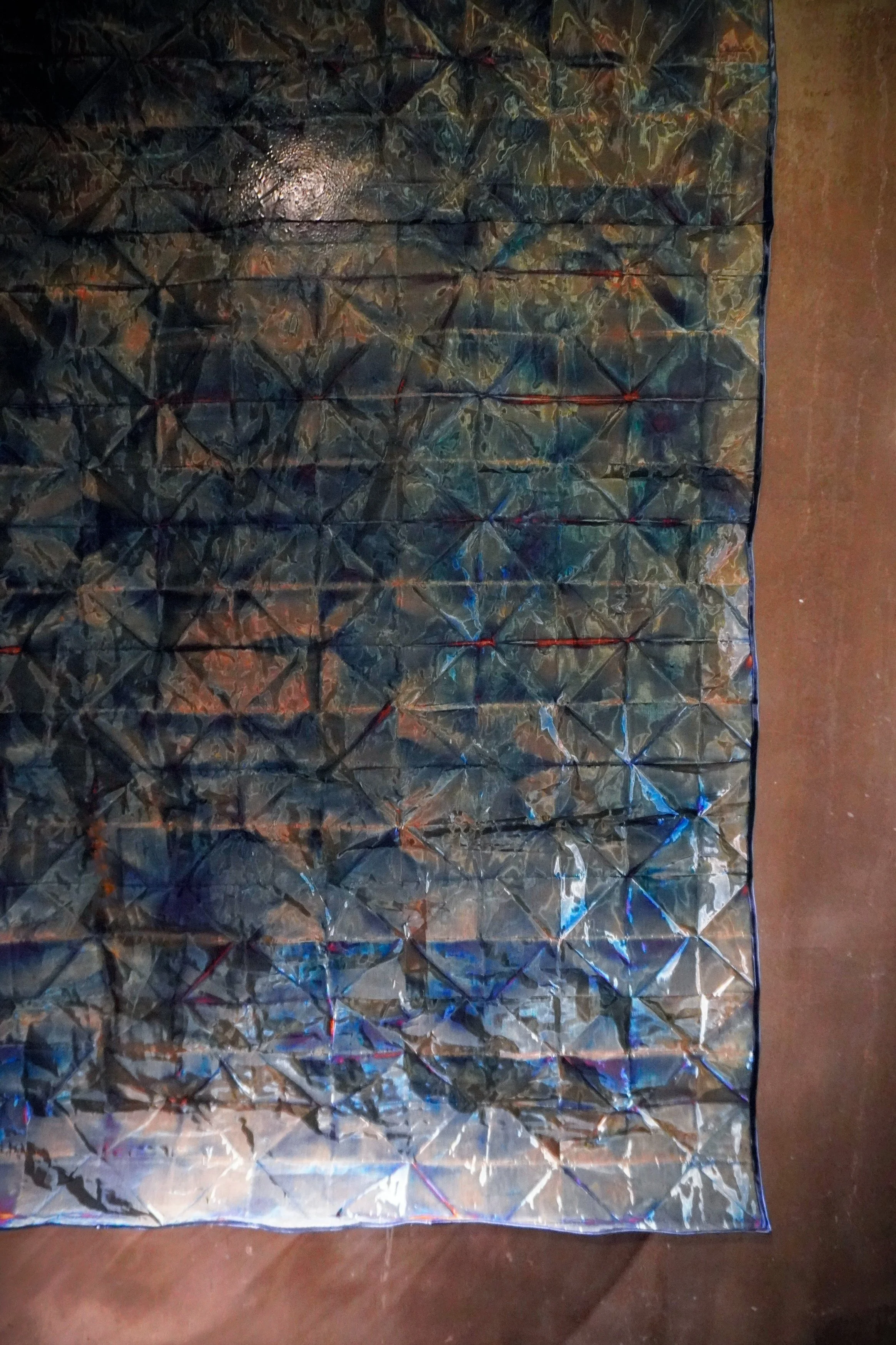 Auroras, captivating natural light displays in the polar regions, inspire a unique fusion of art and science in the creation of stainless steel fabric. Crafted through intricate origami folding, this innovative textile undergoes a transformative process as it encounters heat. The application of heat induces a mesmerizing spectrum of colors, mimicking the ethereal hues of the auroras themselves. The pewter-silk fabric, born from the delicate folds of origami, becomes a radiant testament to the intersection of nature's beauty and human ingenuity.